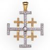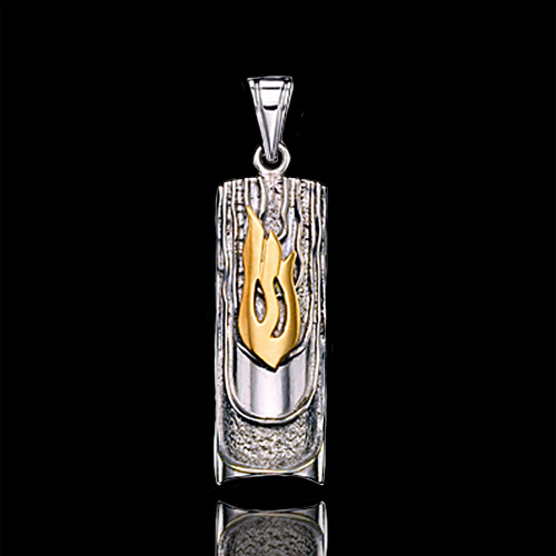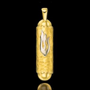 Dieser religiöse Anhänger ist voll von Symbolik. Geschwungene Linien schießen nach oben in dieser Weißgold-Schnitzerei und das Mittelstück aus Gelbgold sieht aus wie lodernde Flammen. Die Verzierung aus Gelbgold ist der hebräsische Buchstabe “Shin” – welcher das kabalistische Zeichen eines machtvollen und schützenden Gottes ist.