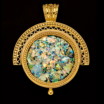 This beautiful iridescent glass is refined from 2,000 year-old glass artifacts discovered in the Holy Land in archeological digs. The shimmering glass setting rivals the beauty of precious stones.