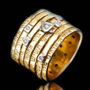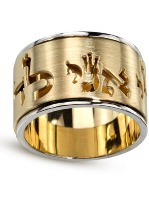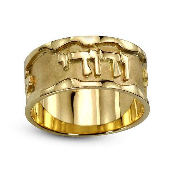 Express your commitment with this ring that declares, “I am for by beloved and my beloved is for me.” This magnificent commitment band has polished gold Hebrew lettering against yellow textured gold and is bordered in a special glittery textured finish. These words of love were written by King Solomon 3,000 years ago and are still the perfect way to express your love on any occasion such as a wedding, anniversary or birthday.