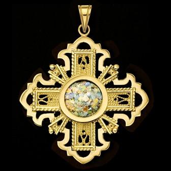 Das leuchtende Mittelstück aus altem römischen Glas ist in den Anhänger eingebettet um Licht und Glanz hinzuzufügen. Das Glas wurde aus veredelten Glasscherben hergestellt, welche aus den Zeiten der römischen Imperiums stammen und in archäologischen Ausgrabungsstellen im Heiligen Land gefunden wurde.