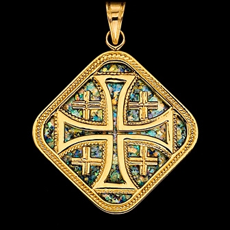 Magnifiek handgemaakt sieraad ingelegd met authentiek 2.000 jaar oud Romeins glas. Het Romeins glas is gemaakt door de oude Romeinen en werd gevonden bij opgravingen in het Heilige Land. Het kruis is verkrijgbaar in 14k of 18k goud en is ongeveer 30 mm groot.