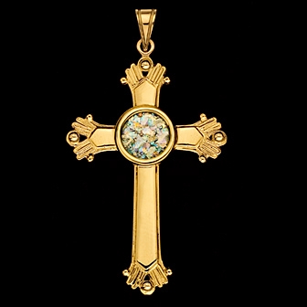 Origineel en uniek handgemaakt sieraad ingelegd met authentiek 2.000 jaar oud Romeins glas. Het Romeins glas is gemaakt door de oude Romeinen en werd gevonden bij opgravingen in het Heilige Land. Het kruis is verkrijgbaar in 14k of 18k goud en is ongeveer 39 mm groot.