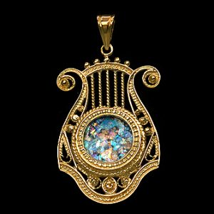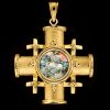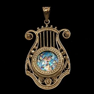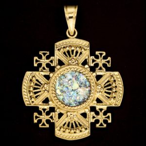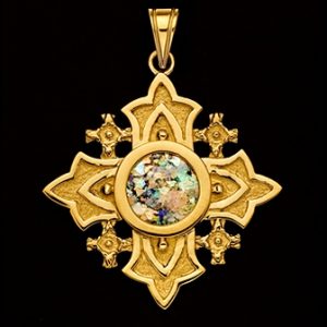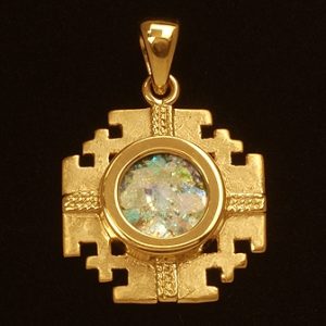 Magnifiek handgemaakt filigraan sieraad ingelegd met authentiek 2.000 jaar oud Romeins glas. Het Romeins glas is gemaakt door de oude Romeinen en werd gevonden bij opgravingen in het Heilige Land. Het kruis is verkrijgbaar in 14k of 18k goud en is ongeveer 35 mm groot.