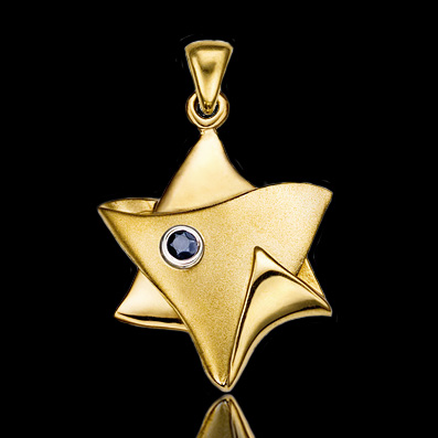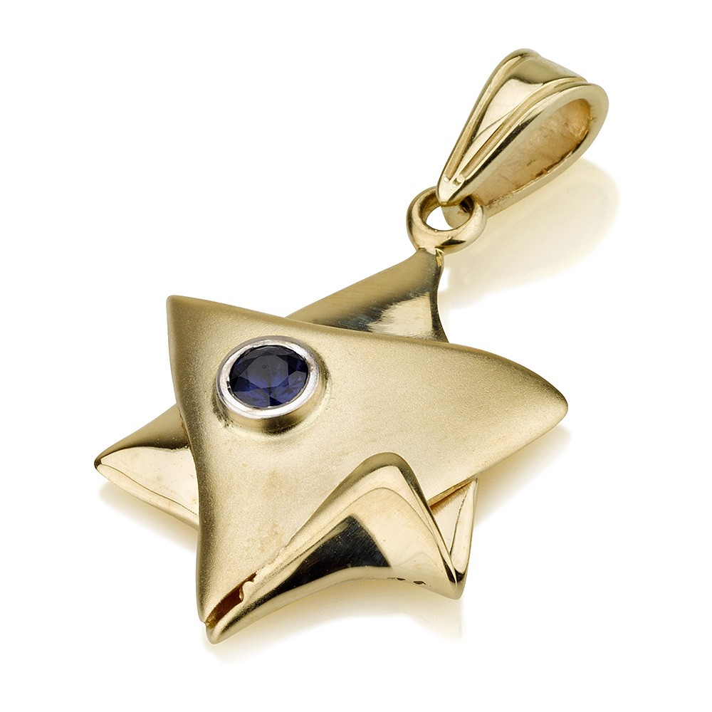 Dieser schöne Davidstern Anhänger ist einechtes Kunstwerk. Es ist eine heikle nochüber eine ausgezeichnete Design derverschlungenen und seidig matt goldDreiecke Umwickeln einander, wie eine umarmung. Der wunderschöne Blaue Sapphire fügt einen reichen bunten Glanzder konstruktions-zeichnung die Einzigartigkeit dieser zeitlosen Element derjüdischen Tradition – Davidstern.