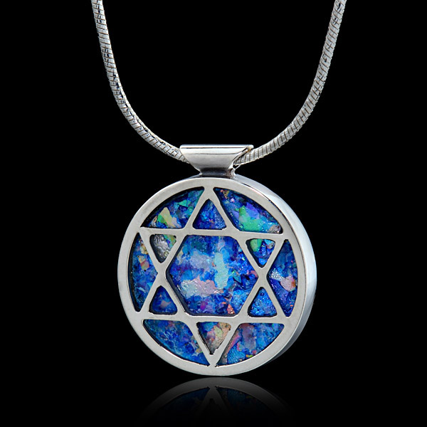Ce très joli collier Etoile de David en argent 925 est fait avec des fragments de verre romain datant de 2000 ans et venant de fouilles archéologiques en Terre Sainte. Enterré pendant des siècles, le verre romain s’est paré des couleurs les plus belles grâce à des réactions chimiques dues au soleil, à l’eau et à la terre.