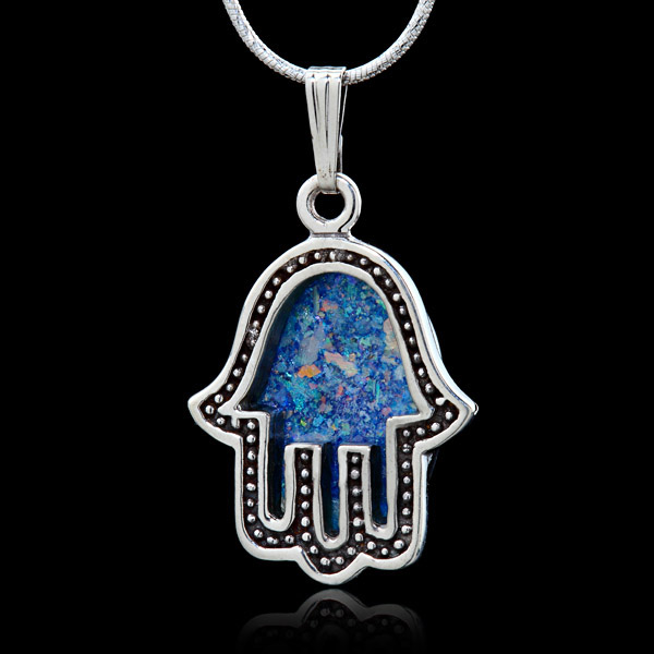 Ce très joli collier Hamsa en argent 925 est fait avec des fragments de verre romain datant de 2000 ans et venant de fouilles archéologiques en Terre Sainte. Enterré pendant des siècles, le verre romain s’est paré des couleurs les plus belles grâce à des réactions chimiques dues au soleil, à l’eau et à la terre.