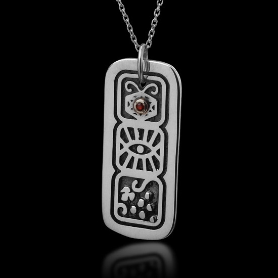 Made from silver and set with a garnet stone, this beautiful disc pendant is entirely handmade. The piece is delicately engraved with images of pomegranate, an eye and grapes. These images transform the piece into a powerful talisman for strength, fertility and protection from the evil eye.