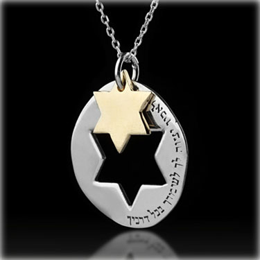 Der Davidstern Anhänger mit einem hebräischen Vers aus dem Buch der Psalmen: “Denn Er wird seinen Engeln befohlen über dir, um dich in allen deinen Wegen” (91: 11). Einen einzigartigen Charme für Andenken.