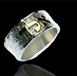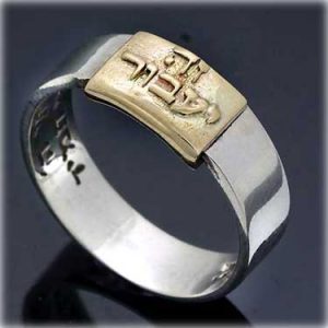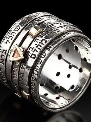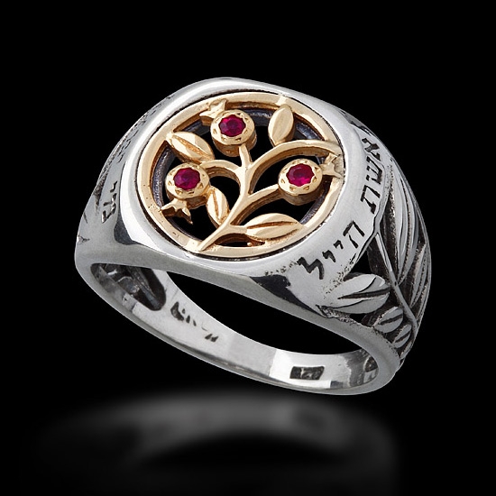 Set with three ruby gems this beautiful ring is delicately carved with images of leaves and pomegranates. It is made of silver and 9 K gold. This one-of-a-kind ring is engraved of the song Woman of Valor (Eshet Chayil): “She opens her mouth with wisdom and a lesson of kindness is on her tongue“.