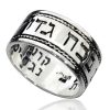 Set with three ruby gems this beautiful ring is delicately carved with images of leaves and pomegranates. It is made of silver and 9 K gold. This one-of-a-kind ring is engraved of the song Woman of Valor (Eshet Chayil): “She opens her mouth with wisdom and a lesson of kindness is on her tongue”.