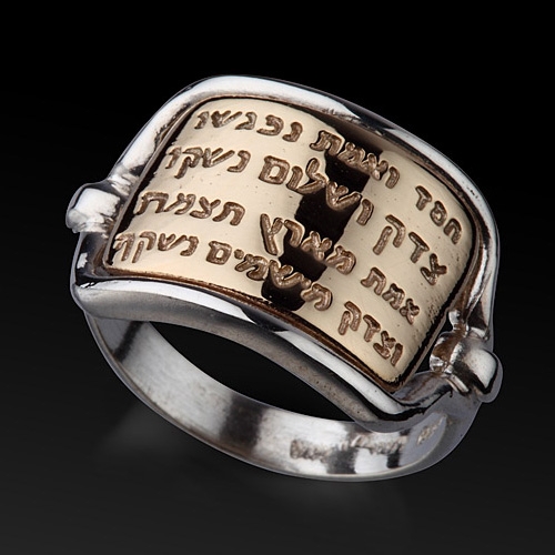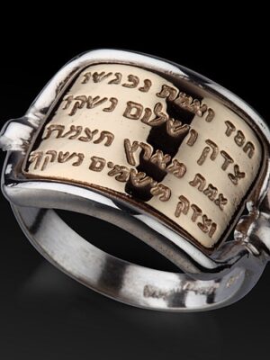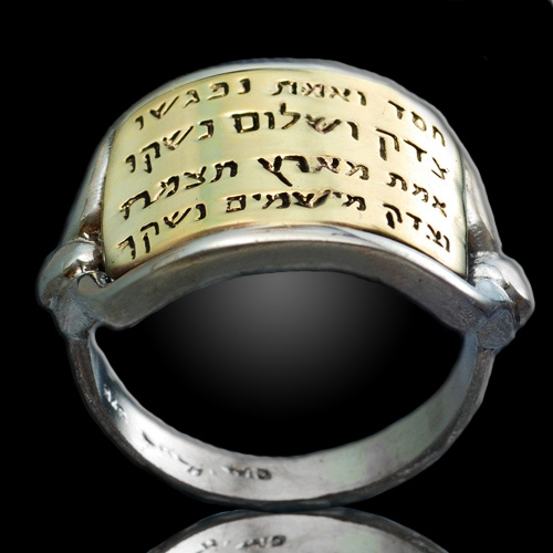 This amazing ancient style Jewish ring, with a gold plate, is beautifully engraved in Hebrew are two poetic verses from the book of Psalms: ” Mercy and truth are met together; righteousness and peace have kissed each other. Truth springiest out of the earth; and righteousness hath looked down from heaven”. (85:11-12).