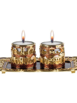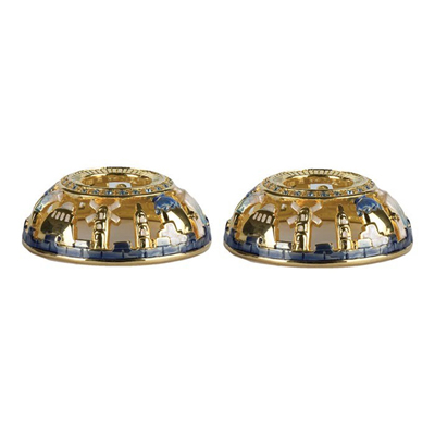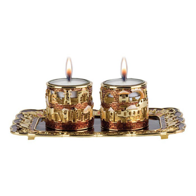 These Pewter Candlesticks are decorated in iridescent Enamel colors, 24kt gold, Sapphire Crystals and feature Old Jerusalem motifs.