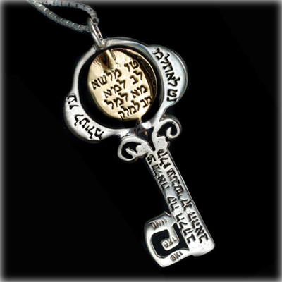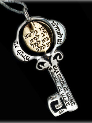 According to sacred Kabbalist sources, the key is a symbol of success and prosperity. All the handcrafted pendants are made of Sterling silver and gold. The bottom part of the key pendant is shaped as the Hebrew letter Peh (פ), while the hollow part of the letter is shaped like the Hebrew letter Bet (ב) in a Biblical style writing. The letter Peh which stands for godly speech creates the letter Bet – thus symbolizing Creation, that is – God in His speech has created the world.