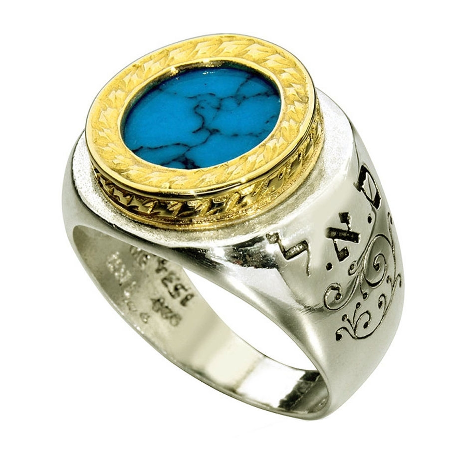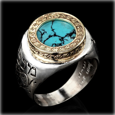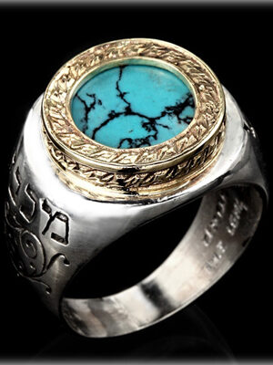 This exceptional Prosperity Kabbalah ring is made of sterling silver and gold. The ring is beautifully set with a Turquoise stone. The silver part is Hebrew engraved with the word Maccabbi . In Hebrew the word Maccabbi also stands for a portion of a verse appraising the God of Israel: “Who is like unto Thee, O LORD, among the mighty?”(book of Exodus, 15: 11). The Kabbalah ring is also engraved with one of the 72 Names of God – Samech-Alef-Lamed. The combination Samech-Alef-Lemed is believed to be a virtue for abundance and success.