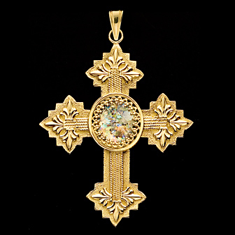 Cette croix fabuleuse est basée sur des motifs traditionnels européens, mais semble être relativement moderne. Abondamment décorés sur les bords de la croix, ce pendentif est décoré en son centre par un cercle de bougies multicolores en verre romain antique. Ce verre est affiné à partir des artefacts datant de 2000 ans et découverts dans le sol de la Terre Sainte et incorporés dans les bijoux modernes créés en Israël juste pour vous.