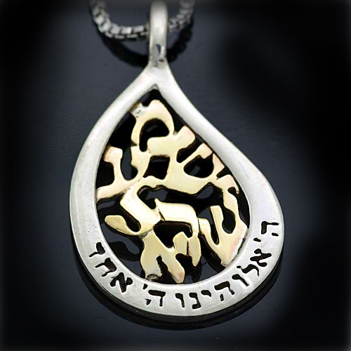 The Hebrew lettering in gold beautifully spells out the words Shema Yisrael (Hear O Israel), in the center of the pendant.