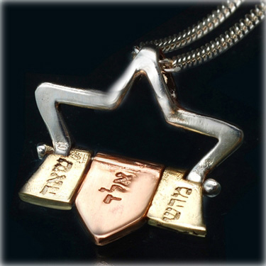 The top half of the Star of David is made of Sterling silver. The bottom part is made of 9K gold and rose gold, each gold plate is engraved with one of the 72 names of G-d, which according to Kabbalistic principles the consists of a three letter sequence