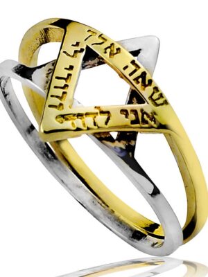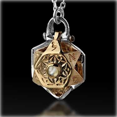 This very unusual piece of Kabbalah jewelry holds many secrets. Set with Chrisoberyl gem (Cat’s eye), the 9K gold Star of David contains the Hebrew verse Shema Yisrael (Hear O Israel) inside. The back of the Star of David Is inscribed with three of the 72 names of G-d.