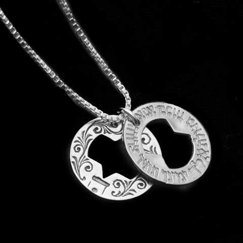 A double silver pendant . On the pendant is engraved the Ana Bekoach prayer (in initials). The prayer is used as a kabbalistic meditation to connect to the power of God.
