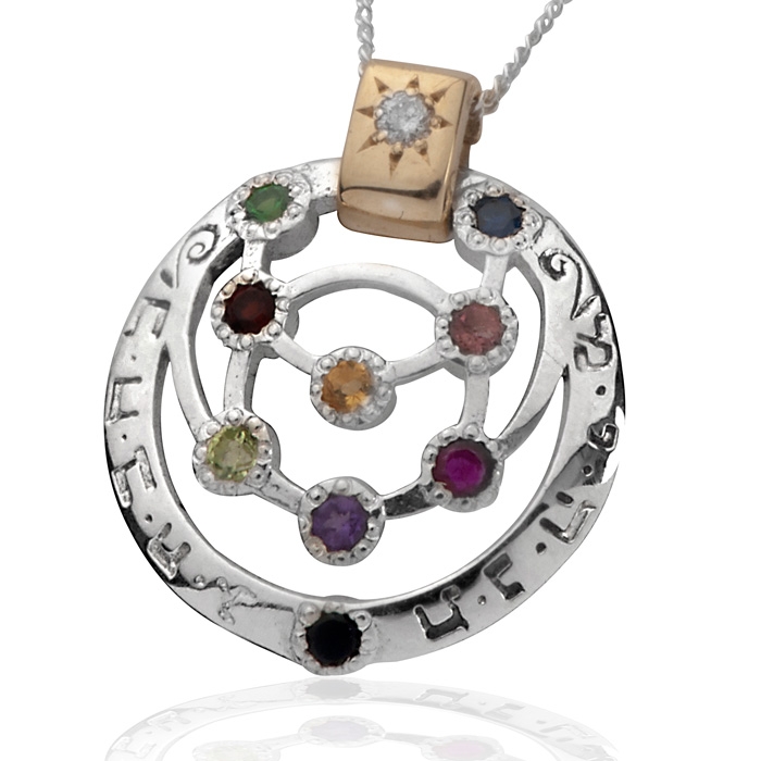 This one-of-a-kind Kabbalah pendant is made of sterling silver and 9K gold and set with precious gems according to the ten sephiroth scheme. The stones represent the ten sephiroth which are ten divine channels that take part in the creation of the world. The Ten Sephirot is a key term in the teachings of the Kabbalah.