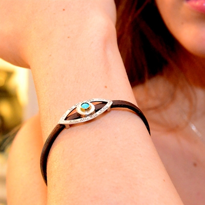 Made from leather, the silver part is inlaid with a Turquoise gem, creating the kind eye motif. The kind eye refers to the positive energies that shield a person from any evil.